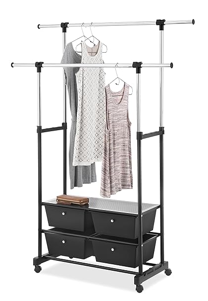 A hanging rod with stoppers on each side can effectively prevent clothes from falling when moving. Clothes rack with drawers add more value to your closet by making it organized and enable you to access everything with ease. Econoco chrome and black heavy duty steel metal rolling clothes z rack with wheels (64 in. Instantly add more closet storage with this garment rack with drawers. ( 4.0 ) out of 5 stars 81 ratings , based on 81 reviews current price $48.97 $ 48. This clothing rack features a unique design that provides you with the perfect space to easily store and hang clothing items like coats, blouses, skirts and so much more. Sold and shipped by eforcity. This drying rack rolls out when needed, and tucks neatly away when not in use (or even when it is in use!) the cabinet below the drying rack drawer is open below, so you can actually hang items off the drying rack, into the cavity of the cabinet below! Vipek 6 tiers wire garment rack v3p heavy duty clothing rack with 2 fabric drawers vipek $146.99 $ 146. Product title better homes & gardens 2 tier garment rack with 3 drawer closet organizer , gray average rating: Clothing racks by material clothing racks come in a variety of materials, including steel, wood, plastic and aluminum. Steel clothes racks offer the most durability, so you'll be able to store all your hanging garments with ease. Its steel frame is adjustable, spanning 35'' to 70.5'' in height and 34'' to 52.8'' in width depending on your.